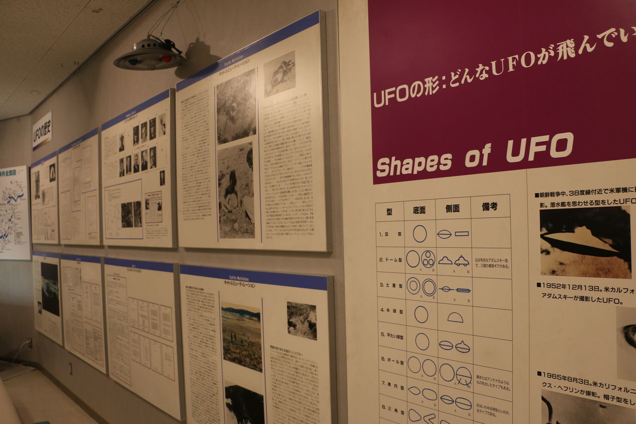 ここを抜けると広々とした展示ゾーンになる。UFO模型、解説パネル、写真パネルなどがある。パネルには例のマジェスティック12だとかガルフ・ブリーズ事件など、今日ではもはやHOAXと言わざるを得ない件を取り上げており、うーむ、どうしたものかなあと思うが、ま、よくよく考えると、そもそも展示全体がオレ視点からいうと疑問のある「UFO=宇宙船」という大前提で組み立てられておるし、いまさら好事家がツッコミを入れるとかそういう対象として考えるのは根本的に違うのではないか、と思い直す。