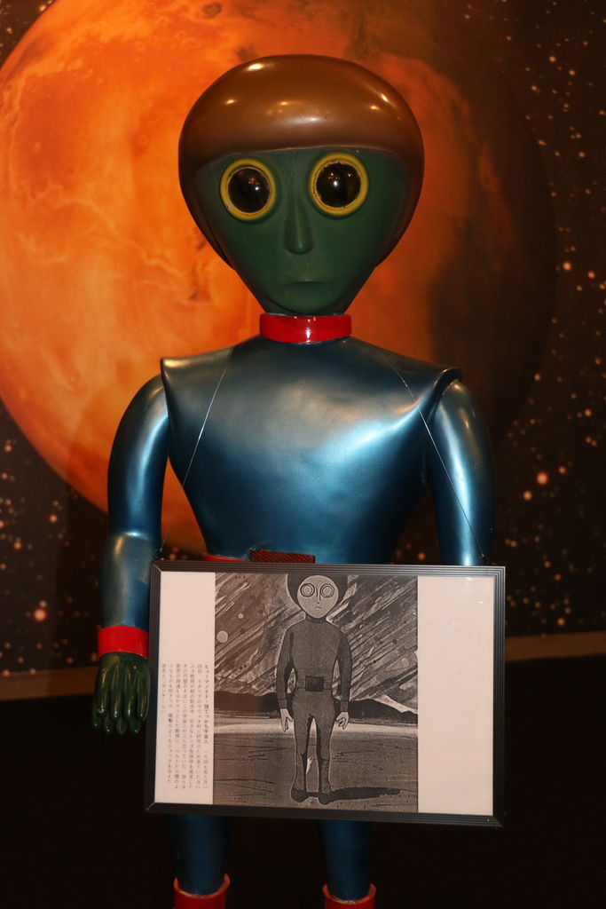 このほか、展示ゾーンにはビデオの再生コーナーがあって、何やらUFO番組みたいなのを流しっぱなしにしていた。あと、忘れてはならないのが「宇宙人エリア」で、いずれもこの世界では「スタァ」的なアイコンとなっておるフラットウッズ・モンスターと、ホプキンスビル事件、ヨハニス事件のエイリアンが立っておる。何故かヨハニス事件のエイリアンだけ3体いた。何故か。