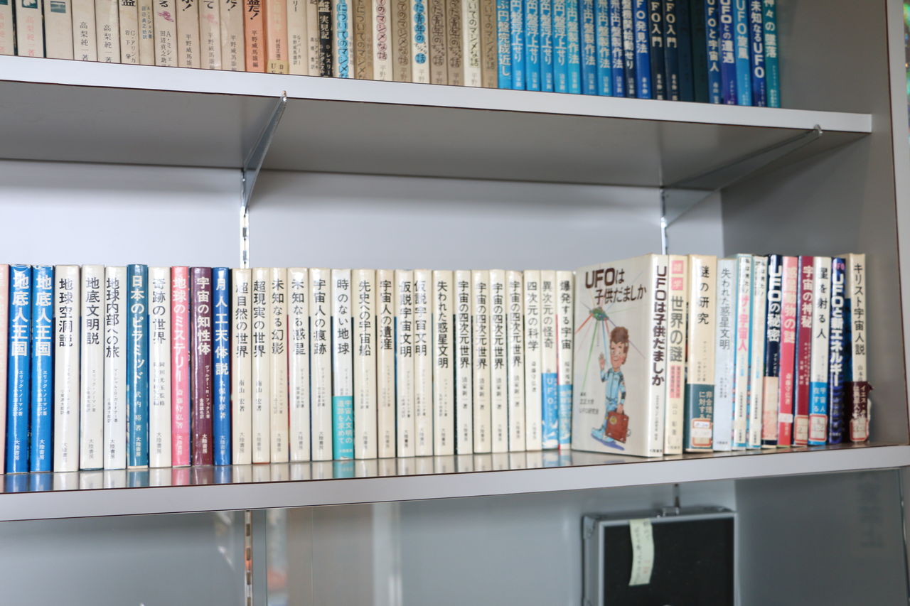 UFOふれあい館は大人入館料400円ナリ。入り口左手には取材で来たらしき芸能人の色紙と雑誌「ムー」のバックナンバー。正面を向くと今はなきUFO研究家・荒井欣一氏からの寄贈になるという書籍類が壁一面に収容されている。大陸書房コーナー、矢追純一コーナーなど何でもアリ。全然知らんような本も多数。GPAニュースレターを十数冊たばねたようなファイルまであった。荒井氏の没後、その資料3000点の寄贈を受けたという話なので、こういう図書の点数も都合数千ということになるのであろう。