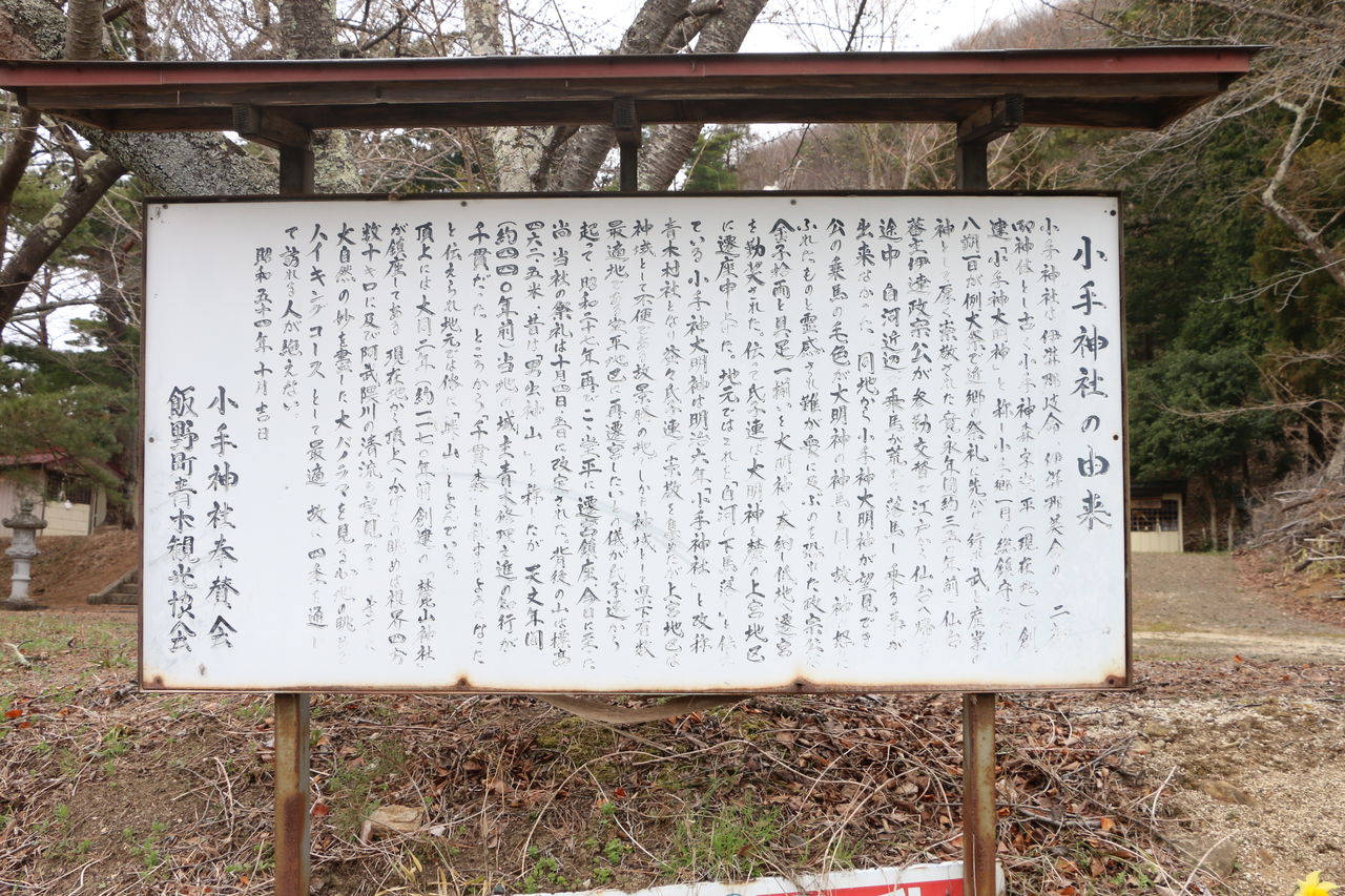 下山後、ふれあい館の近くにあった小手神社というお宮の前を通ったら、神社の由来等々を記した立て看板があって、字はだいぶかすれていたけれども「千貫森の頂上には麓山神社が祀られている」的なことが書いてあった。