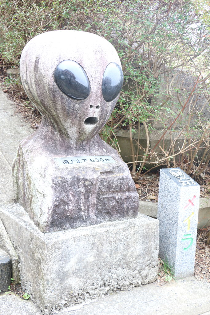それはともかく、東京から高速を飛ばして3時間半。ようやく到着したのであるが、この千貫森の頂上には展望デッキ的なものが建っておるというので、まずはふれあい館のあたりから「UFO道」を経て上まで登ってみた。十数分かかるが、小生も初老ゆえ、けっこう疲れる。道中には怪しげな宇宙人の石像が多数立っておった。