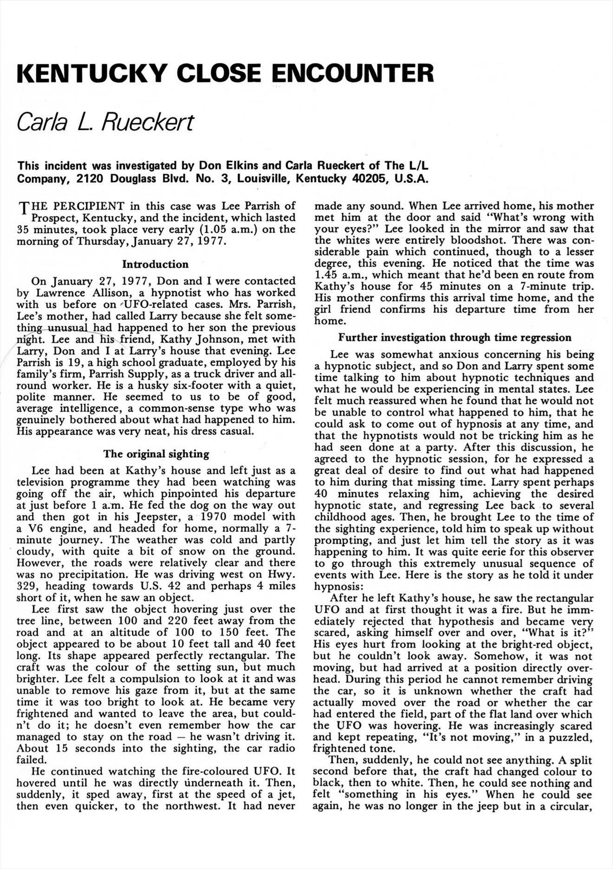 それから彼らは、出現した時と同様に突然消え去った。フロレスはすぐ外に出たが、ボール状の物体が南を指して飛んでいくのが見えた。それから彼はこの出来事を通報するため警察署に行った。フロレスはこの遭遇体験のあと顔の皮がむけたと主張している。彼の両親、友人はいずれもこののち彼の性格が変わってしまったことに気づいた。外向的だった彼は、心配性の内向的な性格になってしまったのである。