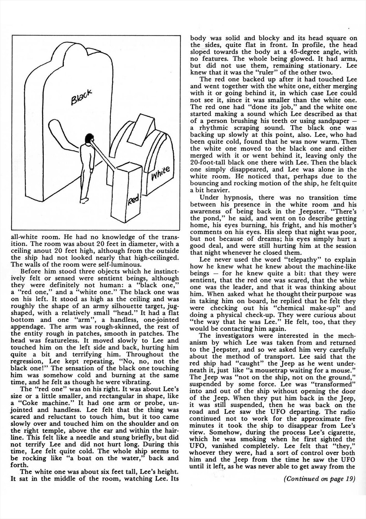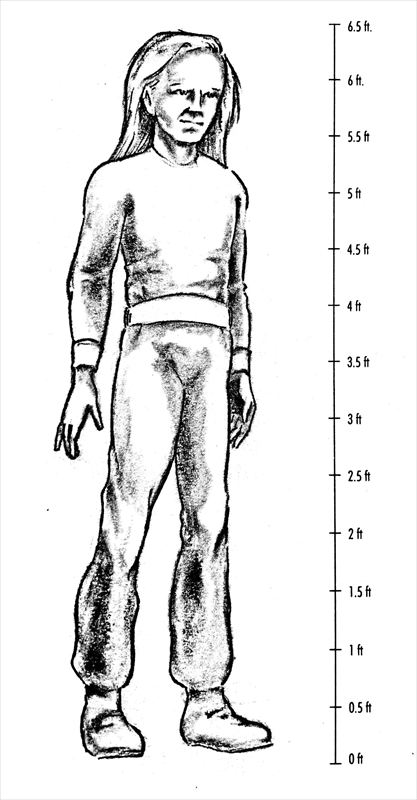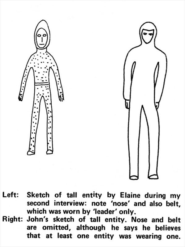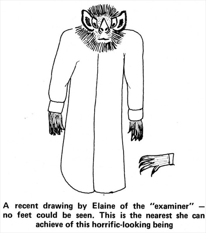 その存在は身長8フィートほど。手は長細く、指は3本だったが真ん中の指が一番長かった。鼻、口、耳がないこともあってか、その顔は無表情だった。目は小さくて黒っぽかった。足はベッドに遮られてよく見えなかった。