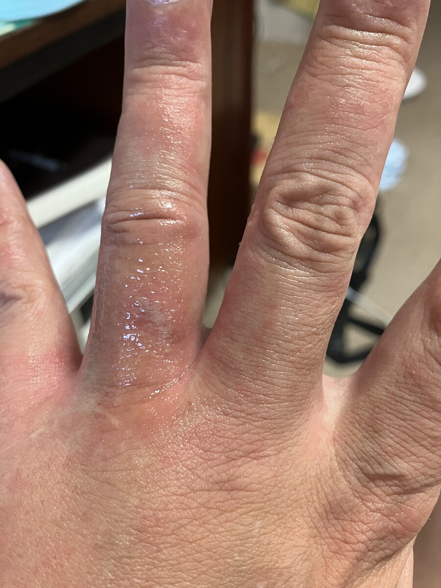 写真はステロイドを左手の薬指に塗ったところ。他の部位も若干赤くなって若干腫れている点に注意